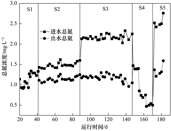 濾柱運(yùn)行過程中進(jìn)出水總氮如圖 3所示.從中可知, 在S1階段(20~41 d)和S4階段(148~170 d)進(jìn)水總氮等于出水總氮, 濾柱中并未有氮素?fù)p失, 而S2階段(42~88 d)、S3階段(90~147 d)和S5階段(172~182 d)均有明顯的氮素?fù)p失, 進(jìn)水總氮大于出水總氮, 且S2階段的氮素?fù)p失量明顯低于S3和S5階段的氮素?fù)p失量, 筆者將在下文中探究氮素?fù)p失的原因.