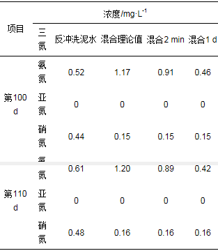 在第100 d時(shí)取反沖洗進(jìn)行2 min時(shí)的反沖洗泥水混合液250 mL, 測(cè)得氨氮、亞氮和硝氮濃度分別為0.52、0和0.44 mg·L-1, 并取500 mL氨氮濃度為1.5 mg·L-1的氨氮溶液, 兩者混合后經(jīng)計(jì)算的理論氨氮、亞氮和硝氮濃度分別為1.17、0和0.15 mg·L-1.從表 2可知, 氨氮溶液與反沖洗泥水混合2 min后實(shí)際的氨氮濃度僅為0.91 mg·L-1, 比理論值低0.26 mg·L-1, 氨氮溶液與反沖洗泥水混合1 d后實(shí)際的氨氮濃度僅為0.46 mg·L-1, 比理論值低0.71 mg·L-1, 而混合后亞氮和硝氮濃度均等于混合理論值, 且整個(gè)過程中均未發(fā)生變化.由此可知, 此小試中氨氮濃度的降低不是生物作用造成, 而是反沖洗泥中鐵錳氧化物對(duì)氨氮的吸附造成, S2、S3和S5階段的氮素?fù)p失或是氨氮被鐵錳氧化物吸附造成.