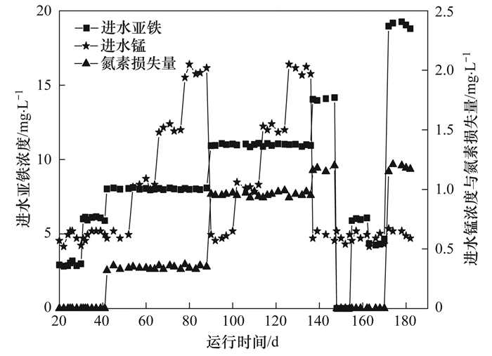 進(jìn)水鐵錳濃度與氮素?fù)p失量的變化情況如圖 4, 下文將分別討論不同進(jìn)水亞鐵及進(jìn)水錳濃度時(shí)氮素?fù)p失的途徑.