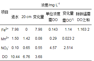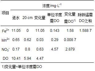 從圖 7(b)及表 5可知, 前20 cm濾層去除亞鐵和錳分別為7.98 mg·L-1和0.08 mg·L-1, 消耗的DO分別為1.14 mg·L-1和0.0232 mg·L-1, 故此范圍亞鐵和錳消耗的DO共為1.1632 mg·L-1, 而進(jìn)水經(jīng)前20 cm消耗的DO為3.68 mg·L-1.因此前20 cm約有2.5168 mg·L-1的DO參與氨氮去除.同由表 5可知, 硝氮在前20 cm產(chǎn)生量為0.55 mg·L-1, 亦假設(shè)此范圍內(nèi)硝氮全是氨氮經(jīng)硝化產(chǎn)生, 則經(jīng)硝化生成0.55 mg·L-1的硝氮所需DO為2.514 mg·L-1, 與上述參與氨氮去除的DO相當(dāng), 故前20 cm生成的硝氮亦全由氨氮經(jīng)硝化產(chǎn)生.在20~200 cm亞鐵、錳、DO、氨氮、亞氮和硝氮變化量分別為0、1.42、2.7、0.50、0和0.50 mg·L-1.假設(shè)此范圍硝氮經(jīng)硝化作用增加, 故計(jì)算可知所需DO共約為2.697 mg·L-1, 與此范圍消耗的DO相當(dāng), 且氨氮變化量與硝氮變化量相等, 故20~200 cm氨氮全經(jīng)硝化去除.由圖 7(a)可知, 在前20 cm有0.88 mg·L-1的氨氮被去除, 且由上可知, 在此范圍內(nèi)有0.55 mg·L-1的氨氮參與硝化, 故前20 cm有0.33 mg·L-1的氨氮損失且未消耗DO, 與該范圍內(nèi)的氮素?fù)p失量相等.亦設(shè)此范圍內(nèi)氨氮全經(jīng)硝化去除, 則氨氮應(yīng)全轉(zhuǎn)化為亞氮和硝氮, 濾柱中沒有氮素?fù)p失, 且ΔNH4+-N/ΔNO3--N的理論值應(yīng)為1, 而此實(shí)驗(yàn)中進(jìn)水經(jīng)前20 cm濾層時(shí)ΔNH4+-N/ΔNO3--N為1.6明顯高于氨氮全經(jīng)硝化時(shí)的理論值, 故此時(shí)氨氮亦不可能僅通過硝化作用去除.具體聯(lián)系污水寶或參見http://wlmqsb.com更多相關(guān)技術(shù)文檔。