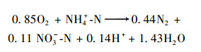 假設(shè)此時(shí)前20 cm氨氮全經(jīng)硝化去除, 則氨氮應(yīng)全轉(zhuǎn)化為亞氮和硝氮, 濾柱中沒有氮素?fù)p失, 且ΔNH4+-N(氨氮變化量)/ΔNO3--N(硝氮變化量)理論值應(yīng)為1, 而此實(shí)驗(yàn)中進(jìn)水經(jīng)過20 cm濾層時(shí)ΔNH4+-N/ΔNO3--N為2.54遠(yuǎn)高于氨氮全經(jīng)硝化的理論值, 由此推斷此范圍內(nèi)氨氮不可能僅經(jīng)硝化去除.有研究表明, 當(dāng)DO一定時(shí)氨氮全程自養(yǎng)脫氮(CANON)分為兩個(gè)過程:①在生物膜外的好氧環(huán)境中, NH4+-N被好氧氨氧化菌(AOB)氧化成NO2--N;②NH4+-N和以上過程產(chǎn)生的NO2--N經(jīng)擴(kuò)散作用進(jìn)入到生物膜內(nèi)的缺氧環(huán)境中, 再在厭氧氨氧化菌(AnAOB)作用下, 發(fā)生反應(yīng)得到去除, 如下式所示.