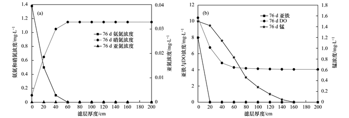 從圖 4可知, 當(dāng)進(jìn)水亞鐵濃度不變, 調(diào)節(jié)進(jìn)水錳(0.6~2.0 mg·L-1)濃度不會(huì)明顯影響濾柱中氮素?fù)p失, 將在下文分析原因.為進(jìn)一步明晰濾柱中氮素?fù)p失, 將分析第76 d時(shí)沿程.圖 7(a)為第76 d時(shí)沿程三氮變化, 從中可知, 進(jìn)水總氮濃度為1.48 mg·L-1, 出水總氮濃度為1.15 mg·L-1, 出水總氮小于進(jìn)水總氮, 濾柱中氮素?fù)p失量為0.33 mg·L-1, 20 cm處總氮濃度為1.15 mg·L-1與出水總氮濃度相等, 相較于進(jìn)水總氮此處亦發(fā)生了氮素?fù)p失, 其氮素?fù)p失為0.33 mg·L-1, 與此時(shí)濾柱中氮素?fù)p失相等, 40 cm處總氮濃度亦為1.15 mg·L-1與20 cm處總氮相等, 由此可知, 當(dāng)平均進(jìn)水亞鐵約為8 mg·L-1, 進(jìn)水錳濃度為1.50 mg·L-1時(shí)其氮素?fù)p失同樣發(fā)生在前20 cm, 之后的濾層中亦未有氮素?fù)p失, 其氮素?fù)p失量為0.33 mg·L-1.