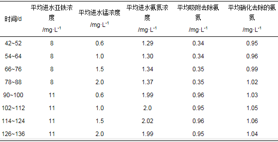 (2) 在此工藝中保持進(jìn)水錳濃度不變, 調(diào)節(jié)進(jìn)水亞鐵升至一定濃度時(shí)濾層中亞鐵氧化形成的氧化物會(huì)吸附氨氮, 導(dǎo)致氨氮通過吸附和硝化兩種作用去除, 且吸附作用先于硝化作用.