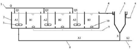 1- 污水進(jìn)水管;2- 多段多級(jí) AO 反應(yīng)池;3- 攪拌裝置;4-AO 反應(yīng)池出水管;5- 二沉池;6- 二沉池出水管;7- 剩余污泥排放管;8- 剩余污泥回流管;9- 曝氣管;10- 曝氣盤圖 1 多段多級(jí) AO 工藝流程