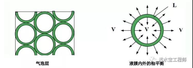 這種在特定環(huán)境下形成的氣泡層,液相L依然是連續(xù)相,氣泡層內(nèi)被包裹的氣相V是分散相。氣泡的內(nèi)、外表面即氣液相傳質(zhì)的相界面。兩相接觸時(shí),氣泡膜的內(nèi)外表面上隨即發(fā)生相平衡的物質(zhì)轉(zhuǎn)移,并完成液膜傳質(zhì)過(guò)程。因?yàn)闅馀輰觾?nèi)氣泡的直徑較小,因此兩相之間的傳質(zhì)距離極短,氣泡的數(shù)量巨大,氣泡層的更新頻率較高,從而使我們可以在一定時(shí)間內(nèi)獲得遠(yuǎn)高于傳統(tǒng)氣液傳質(zhì)設(shè)備的比表面積和傳質(zhì)速率,大幅度提高設(shè)備的傳質(zhì)效率。