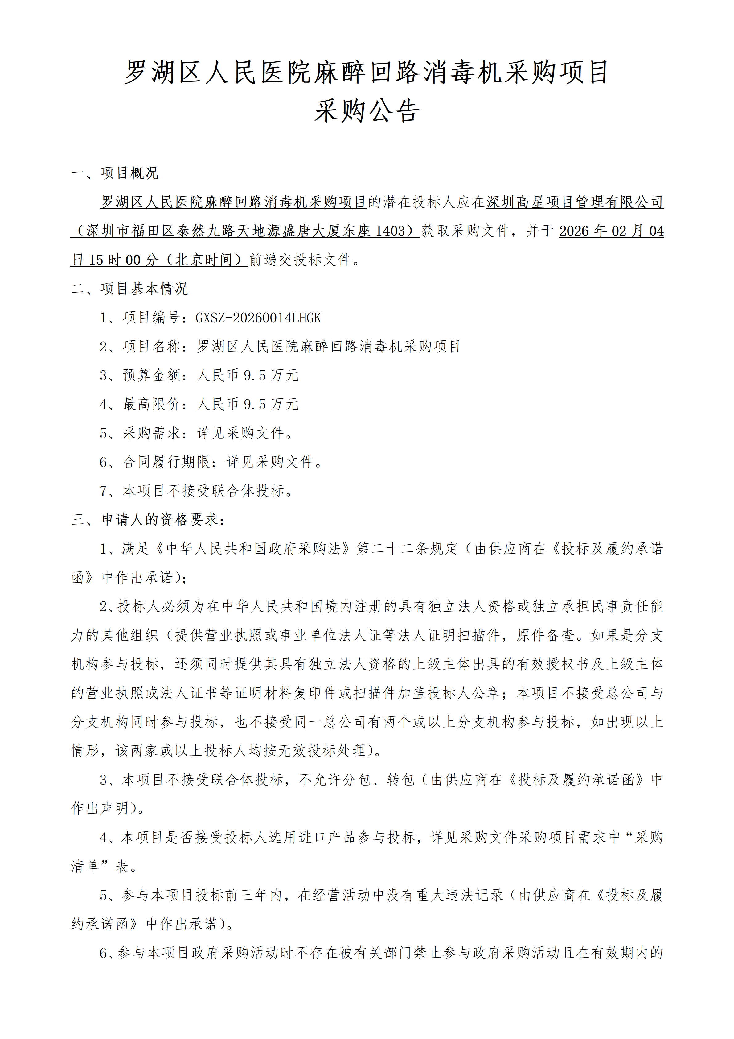 廣東羅湖區(qū)人民醫(yī)院麻醉回路消毒機(jī)采購項目的采購公告